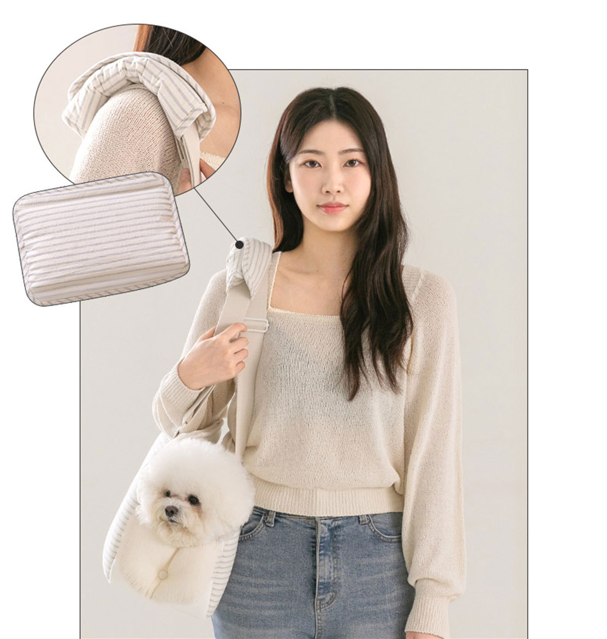 ボーダー柄の外側ポケットは収納力抜群で、お散歩グッズも一緒に持ち運べます。