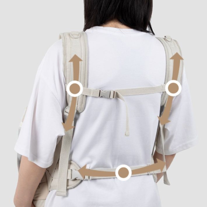 幅広の肩紐と背面ベルトで体への負担を軽減し、長時間の使用でも疲れにくい設計です。